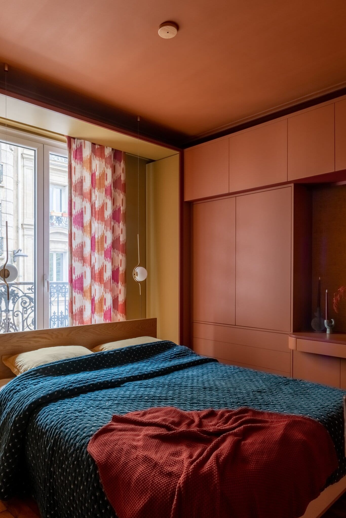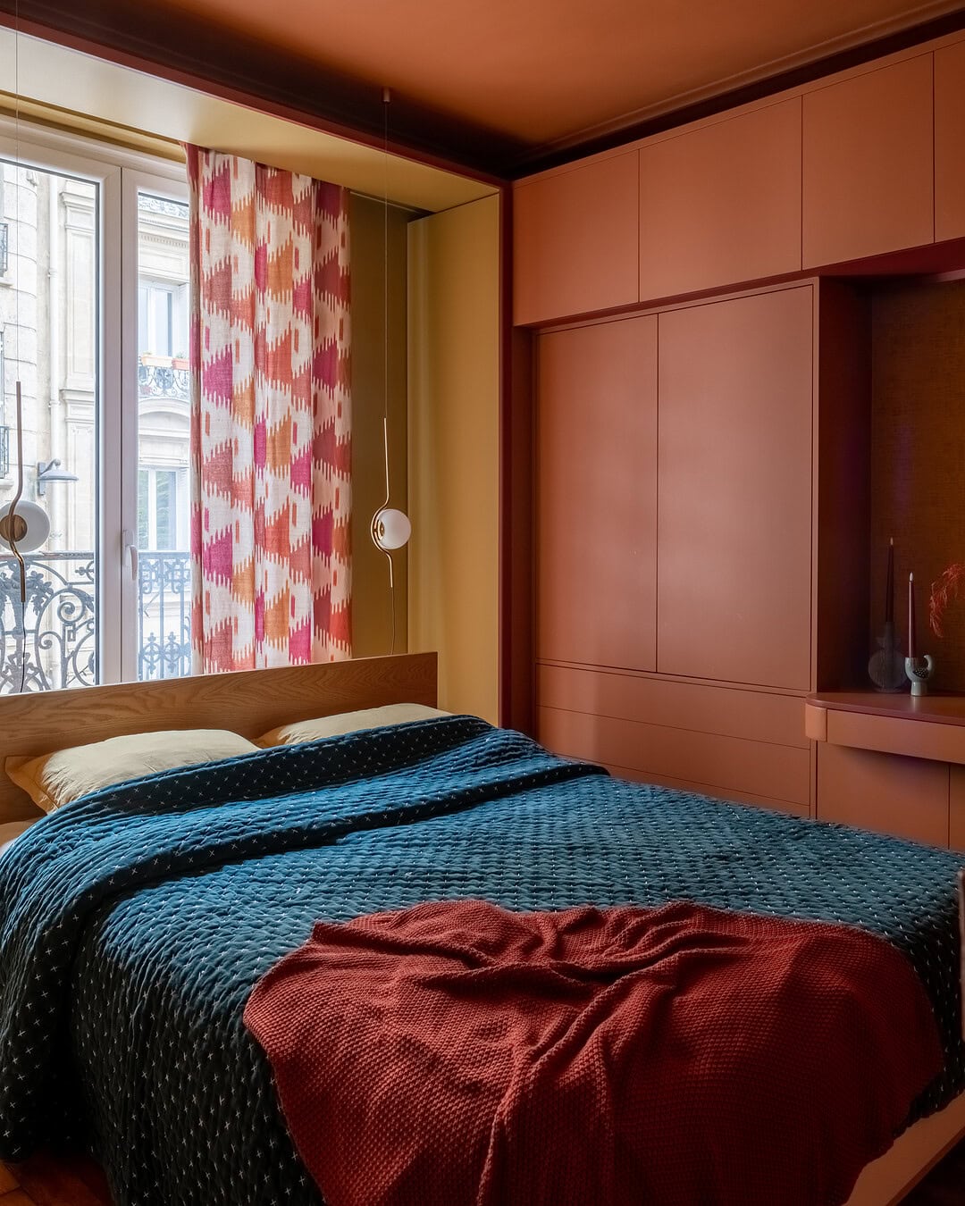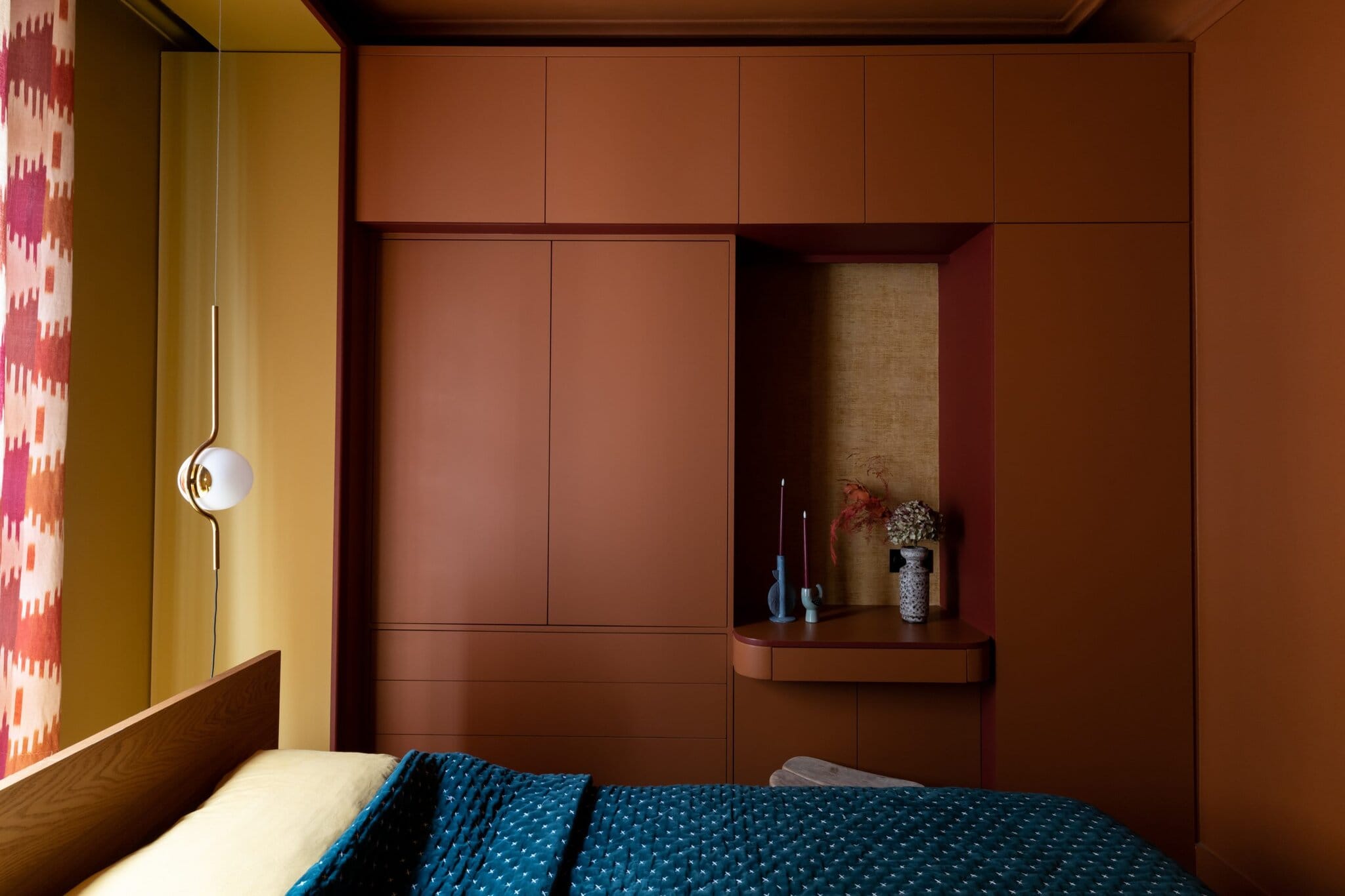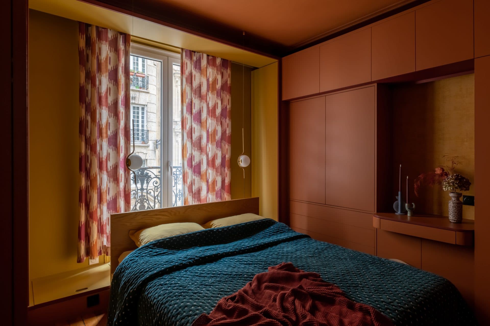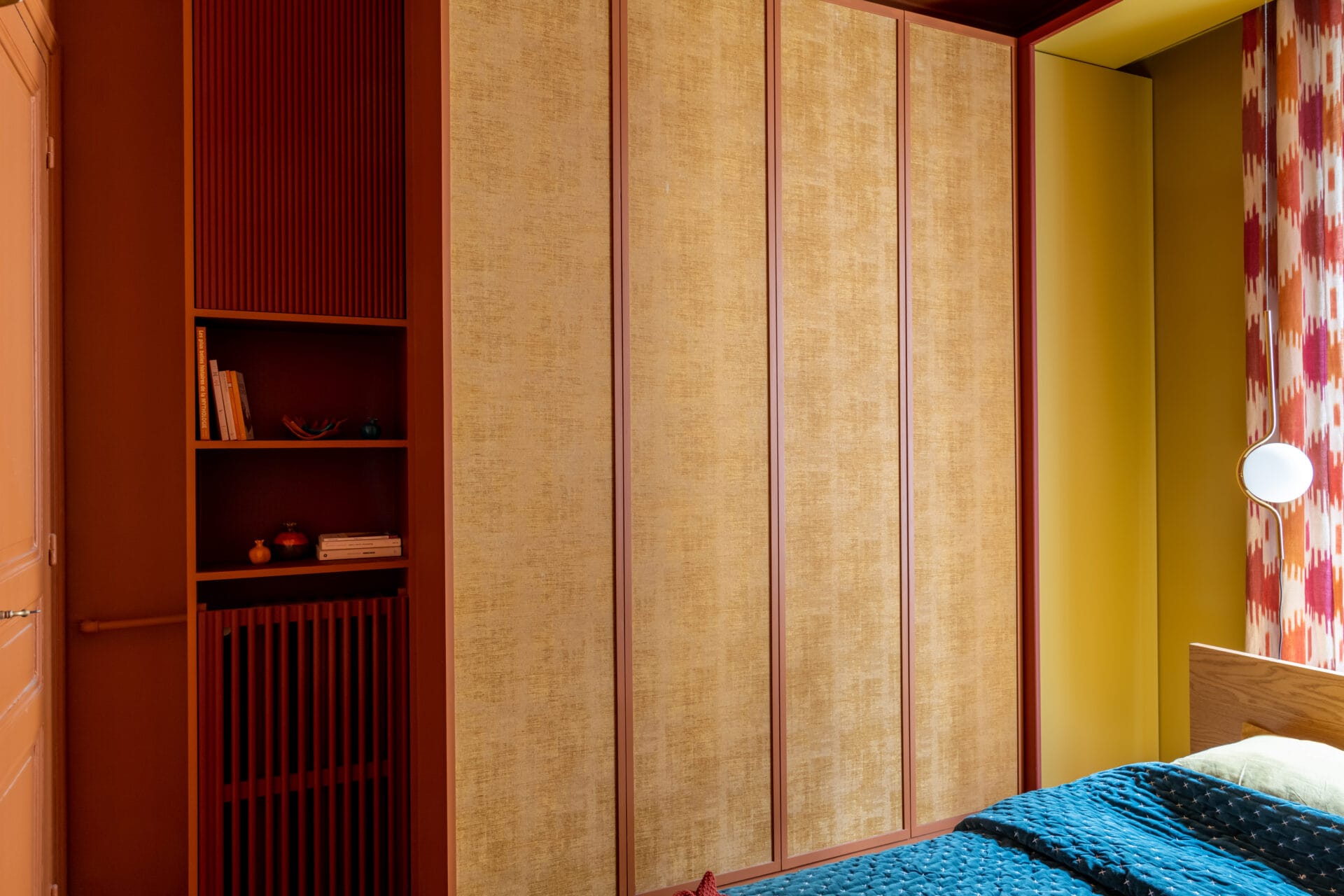 Une chambre sur mesure pensée comme un cocon chaleureux, alliant rangements intégrés et palette chromatique vibrante