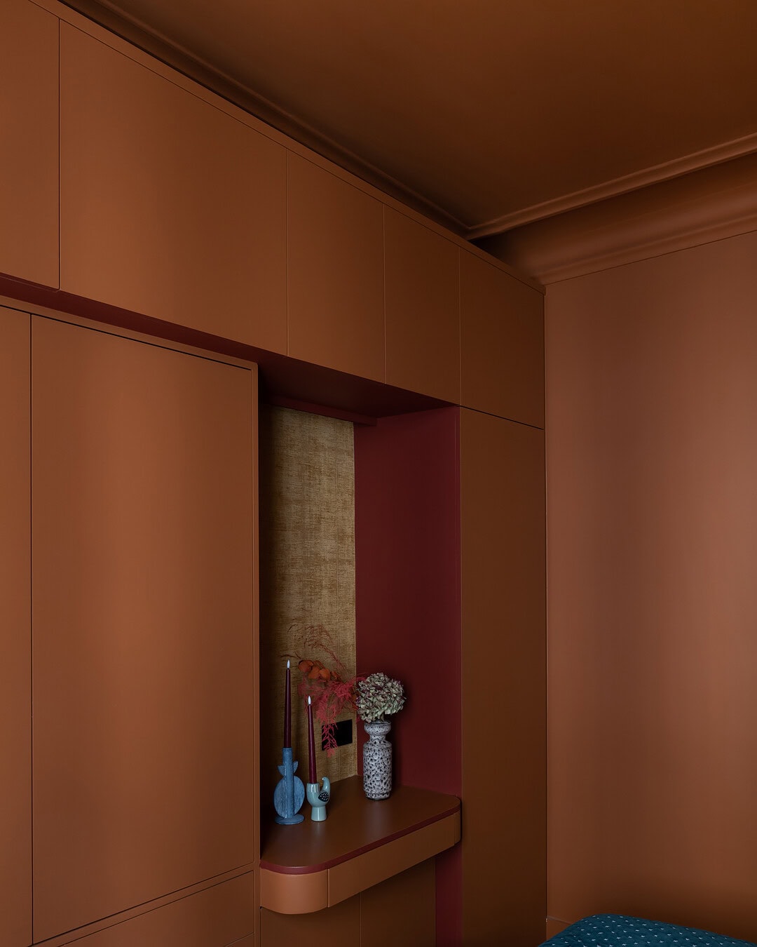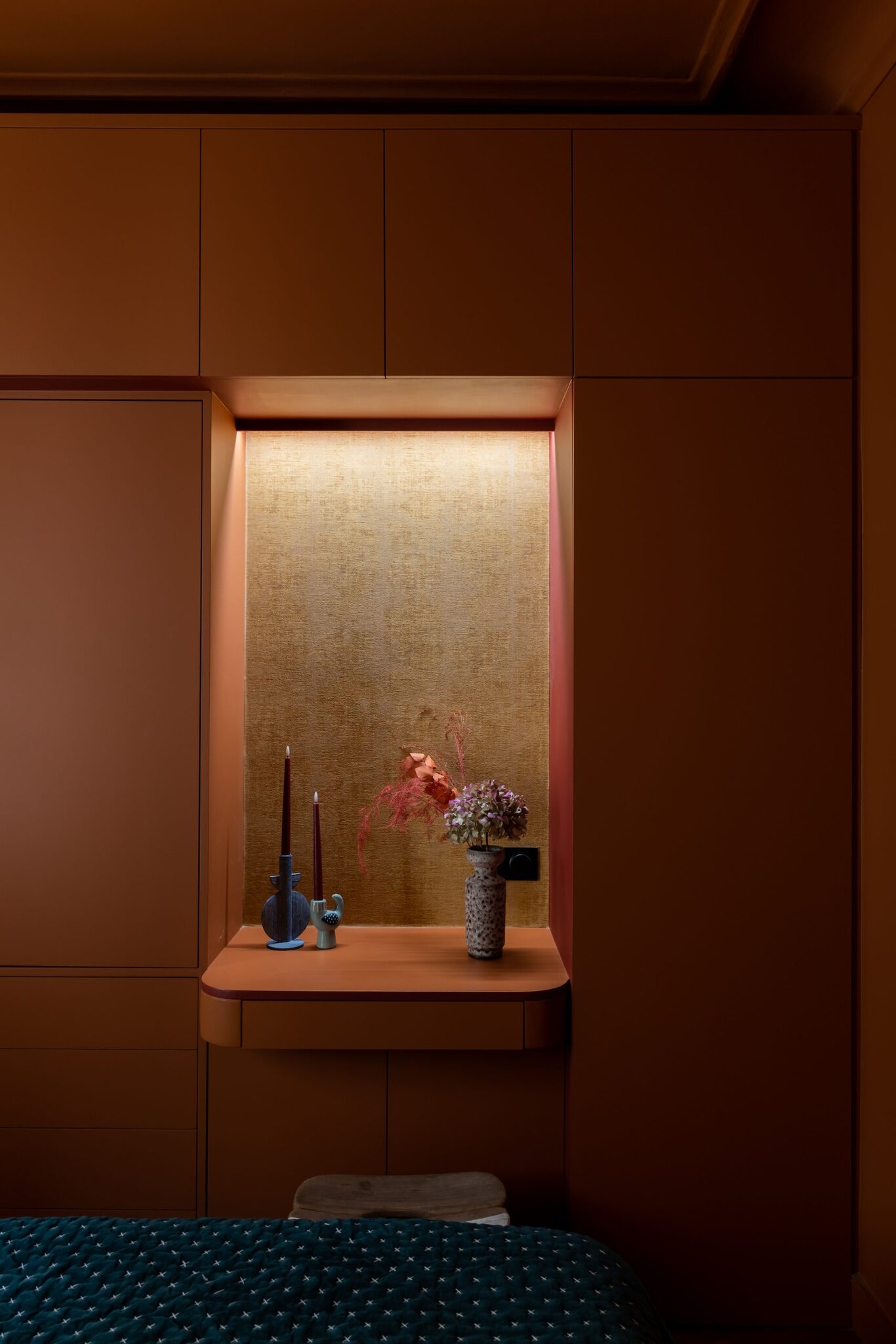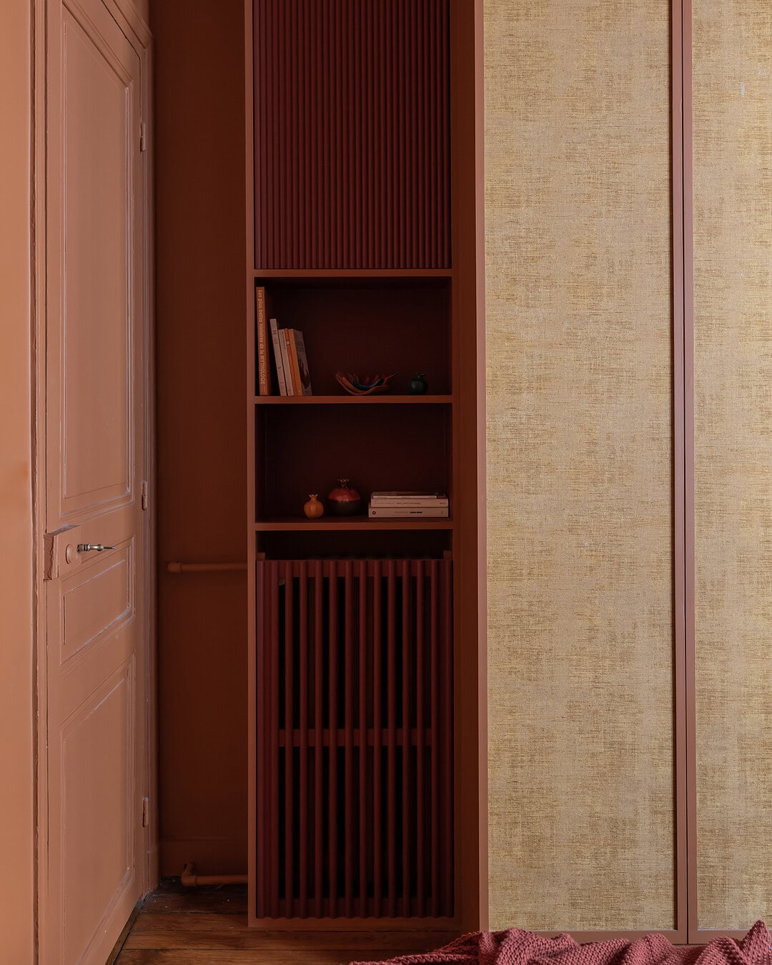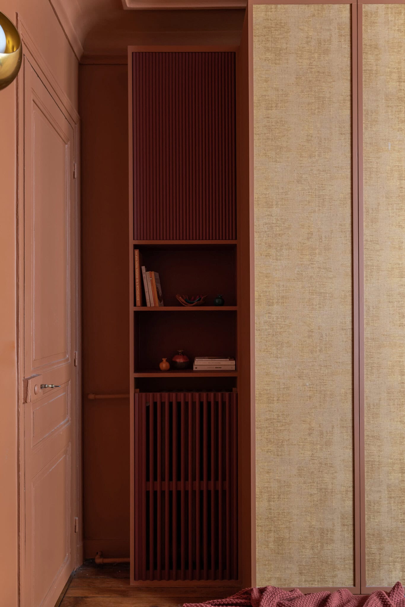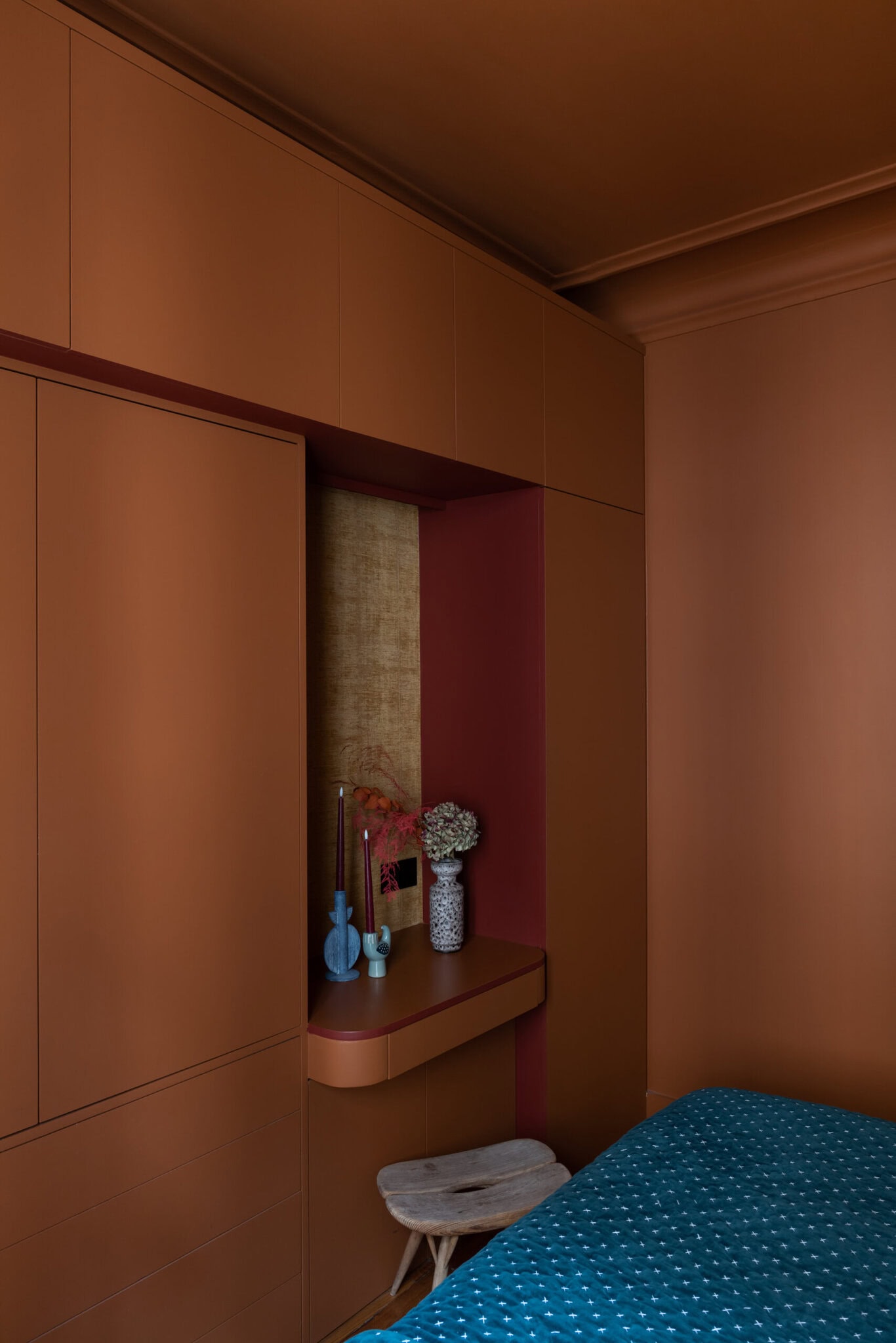 Une chambre sur mesure pensée comme un cocon chaleureux, alliant rangements intégrés et palette chromatique vibrante